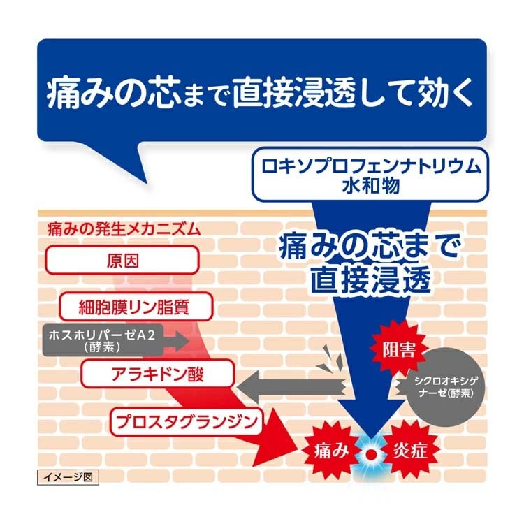●すぐれた鎮痛消炎効果をもつロキソプロフェンナトリウム水和物が痛みの芯まで直接浸透してしっかり効く。