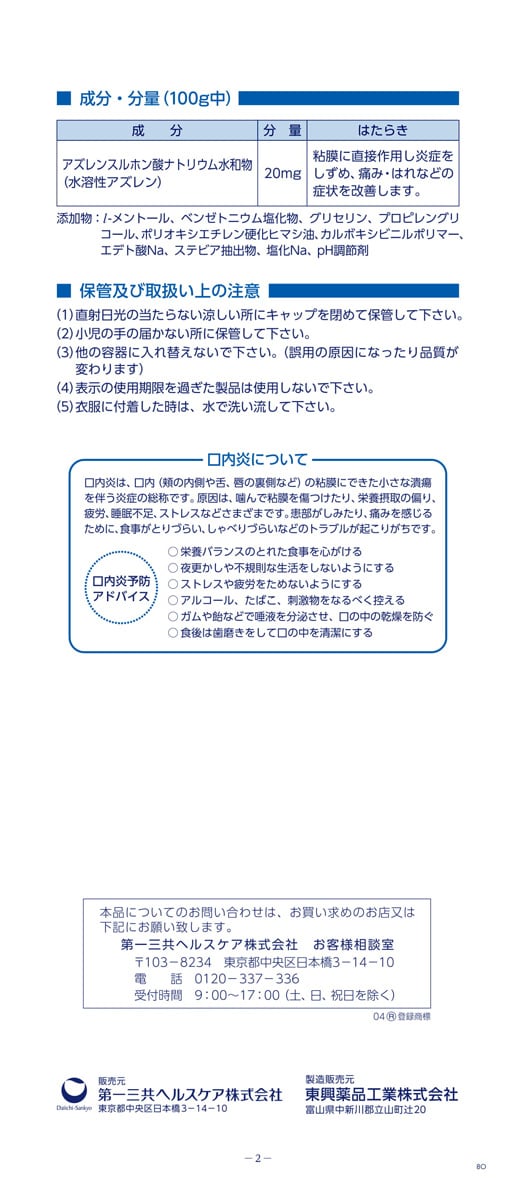 | 100g中 アズレンスルホン酸ナトリウム水和物(水溶性アズレン):20mg 添加物:l-メントール、ベンゼトニウム塩化物、グリセリン、プロピレングリコール、ポリオキシエチレン硬化ヒマシ油、カルボキシビニルポリマー、エデト酸Na、ステビア抽出物、塩化Na、pH調節剤 |