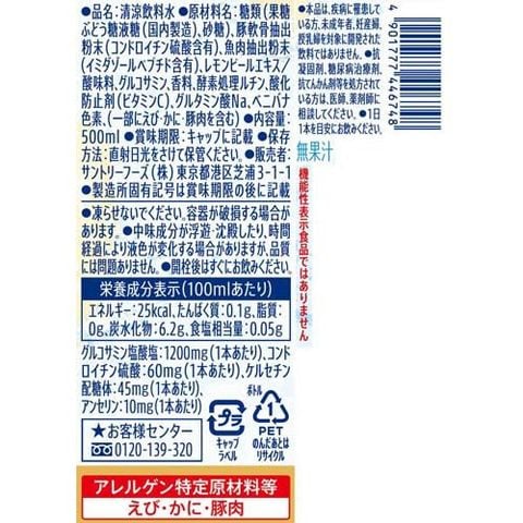 | 糖類(果糖ぶどう糖液糖(国内製造)、砂糖)、豚軟骨抽出粉末(コンドロイチン硫酸含有)、魚肉抽出粉末(イミダゾールペプチド含有)、レモンピールエキス/酸味料、グルコサミン、香料、酵素処理ルチン、酸化防止剤(ビタミンC)、グルタミン酸Na、ベニバナ色素、(一部にえび・かに・豚肉を含む) |