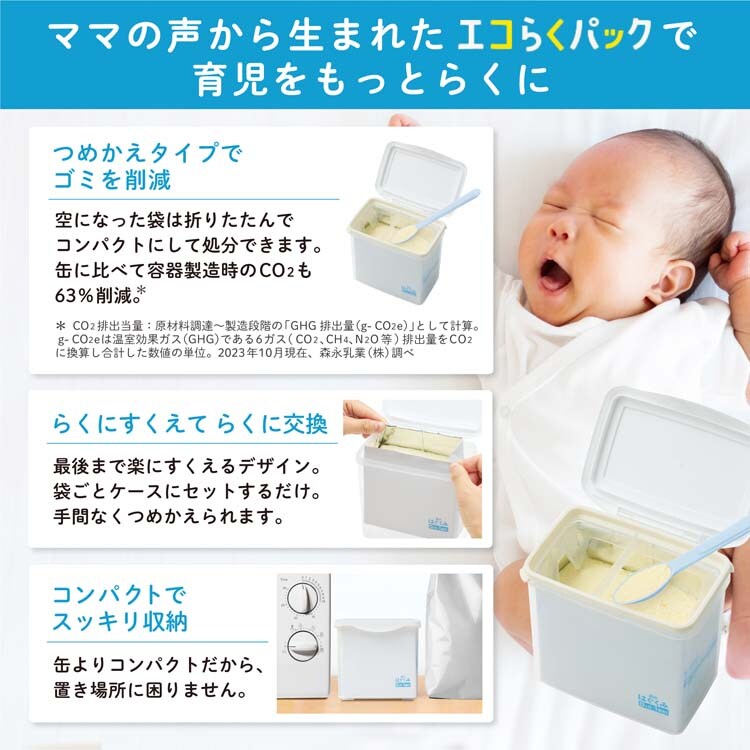・エコらくパックは専用ケースに袋ごと入れかえてご使用ください。専用ケースや缶に粉ミルクだけをつめかえることはおやめください。