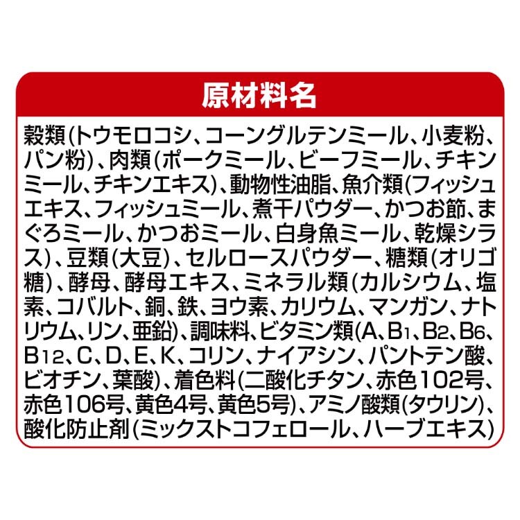 穀類(トウモロコシ、コーングルテンミール、小麦粉、パン粉)、肉類(ポークミール、ビーフミール、チキンミール、チキンエキス)、動物性油脂、魚介類(フィッシュエキス、フィッシュミール、煮干パウダー、かつお節、まぐろミール、かつおミール、白身魚ミール、乾燥シラス)、豆類(大豆)、セルロースパウダー、糖類(オリゴ糖)、酵母、酵母エキス、ミネラル類(カルシウム、塩素、コバルト、銅、鉄、ヨウ素、カリウム、マンガン、ナトリウム、リン、亜鉛)、調味料、ビタミン類(A、B1、B2、B6、B12、C、D、E、K、コリン、ナイアシン、パントテン酸、ビオチン、葉酸)、着色料(二酸化チタン、赤色102号、赤色106号、黄色4号、黄色5号)、アミノ酸類(タウリン)、酸化防止剤(ミックストコフェロール、ハーブエキス)