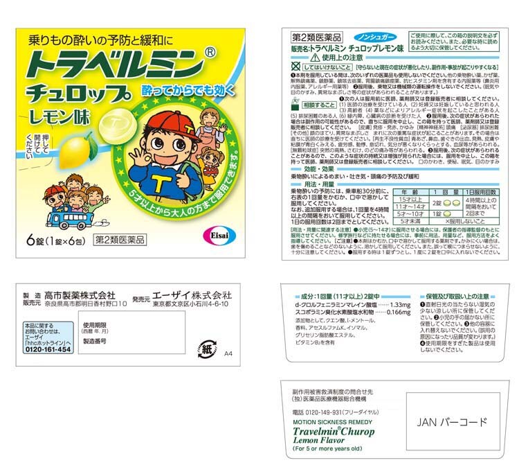 ●トラベルミンチュロップレモン味は、乗りもの酔いによるめまい・吐き気などの症状を予防・緩和し、旅行やお出かけを快適で楽しいものにするためのお薬です。