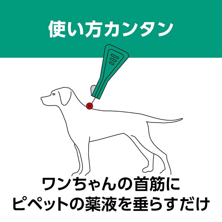 8週齢以上の犬の肩甲骨間背部の被毛を分け、皮膚上の1部位に直接次のピペット全量を滴下する。