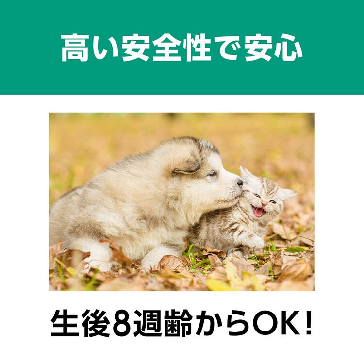 ・本剤は、投与後の犬と小児との接触を避けるよう大人が注意を払える時間帯に投与すること。特に、3歳以下の幼児が投与後の犬に触れた場合、その手を口に持って行く可能性があり、体重あたりの薬剤暴露量も大人より大きくなるので、3歳以下の幼児がいる家庭で本剤を使用する場合は、投与部位が完全に乾くまで投与した犬と幼児との接触を完全に避けること。また、その後も幼児が投与した犬に触れた場合は、必ず石けんでよく洗うこと。