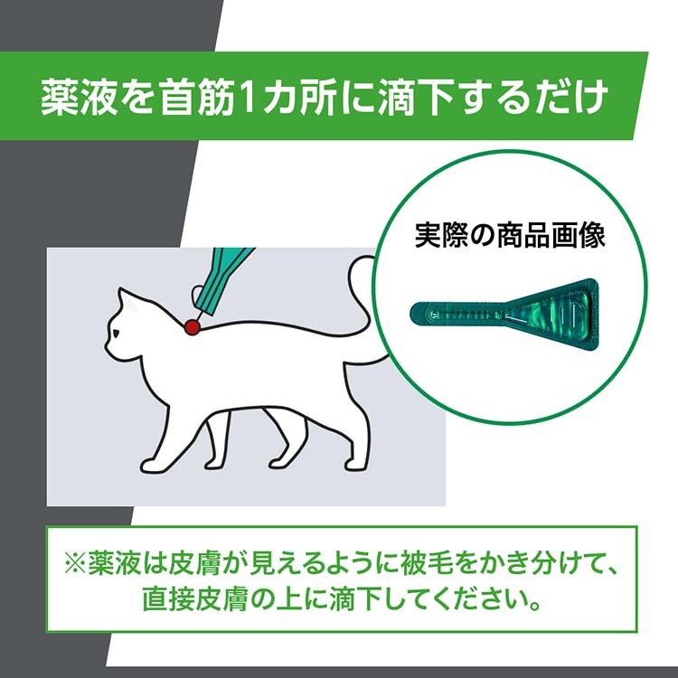 8週齢以上の猫の肩甲骨間背部の被毛を分け、皮膚上の1部位にピペット全量を滴下する。