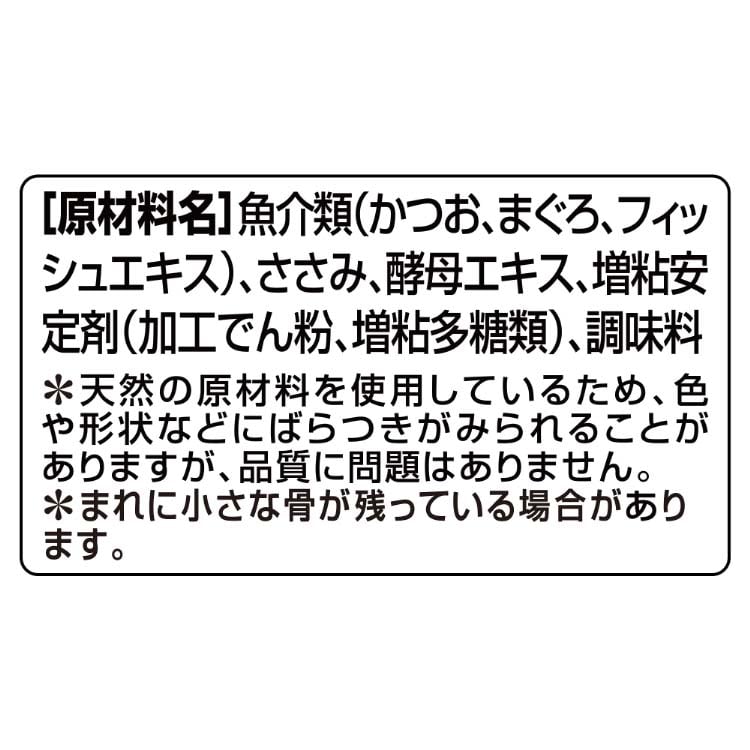 | 魚介類(かつお、まぐろ、フィッシュエキス)、ささみ、酵母エキス、増粘安定剤(加工でん粉、増粘多糖類)、調味料×天然の原材料を使用しているため、色や形状などにばらつきがみられることがありますが、品質に問題はありません。×まれに小さな骨が残っている場合があります。 |