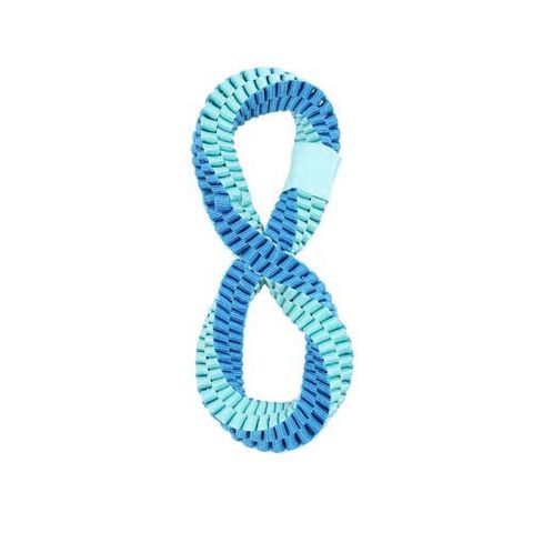 ●丈夫なナイロンテープを2重の輪つなぎのように編み、さらに「無限」を表すインフィニティ型に捻りを加えた不思議な形状の犬用おもちゃです。