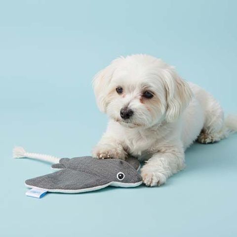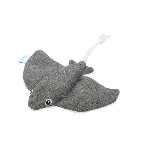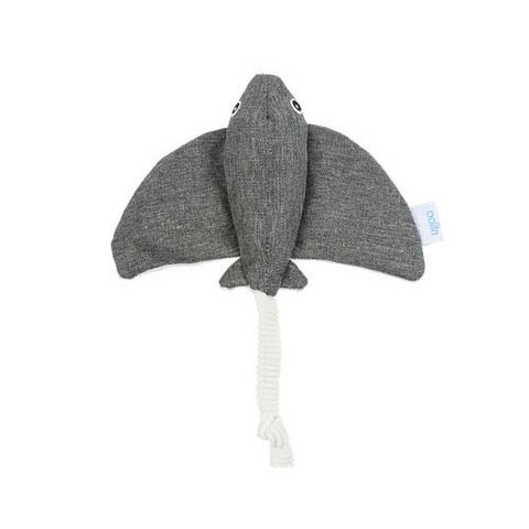 ●カシャカシャ鳴る素材でできた大きなヒレを持つエイ型ぬいぐるみです。胴体に小さなスクイーカーが入っています。