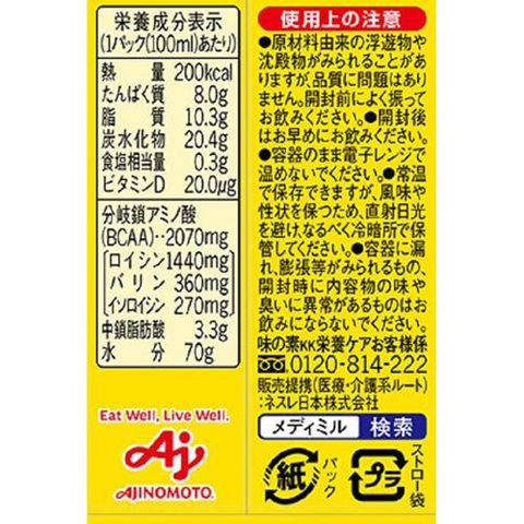 | 1パック(100ml)あたり エネルギー:200kcal、たんぱく質:8.0g、脂質:10.3g、炭水化物:20.4g、食塩相当量:0.3g、ビタミンD:20.0μg 分岐鎖アミノ酸(BCAA):2070mg(ロイシン:1440mg、バリン:360mg、イソロイシン:270mg)、中鎖脂肪酸:3.3g、水分:70g |
