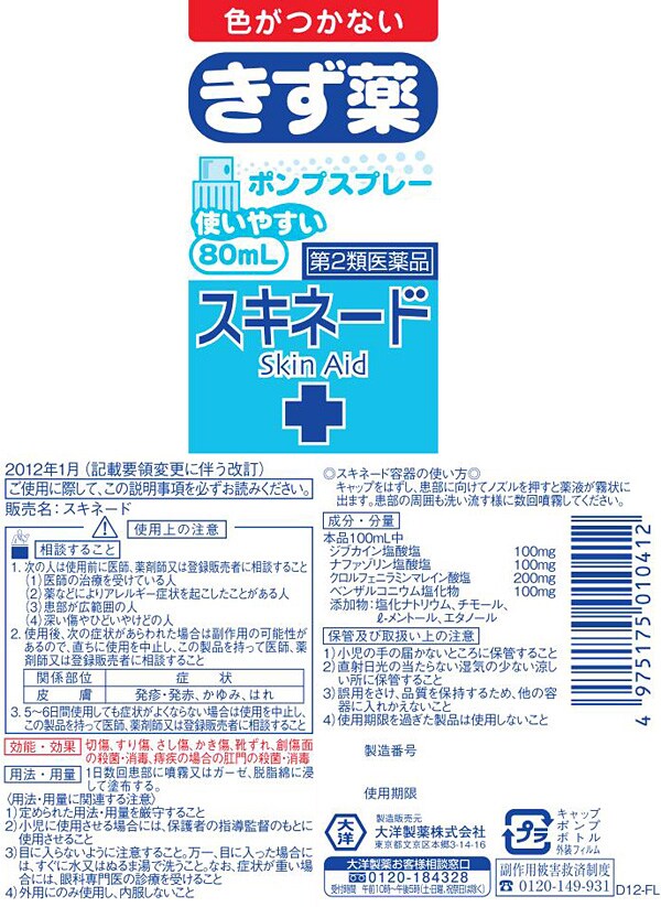 | (100mL中) ジブカイン塩酸塩:100mg ナファゾリン塩酸塩:100mg クロルフェニラミンマレイン酸塩:200mg ベンザルコニウム塩化物:100mg 添加物:塩化ナトリウム、チモール、L-メントール、エタノール |