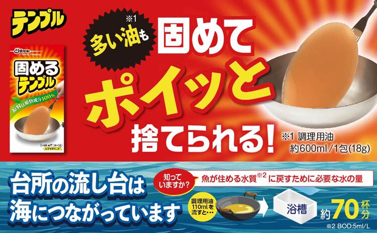 ●ゴミの収集では液体ゴミが困り物です。牛乳パックやビニール袋に新聞紙などを入れ油を捨てると、油が液体で残っていることがあります。固めるテンプルは油をしっかり固めるので、安心して油を捨てられます。