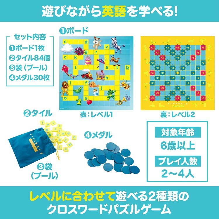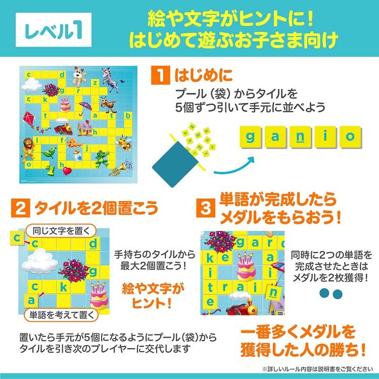 ●レベル1:ボード上のイラストをヒントに単語をつくります。単語ができたらメダルを獲得!すべての単語が完成した時、最も多くのメダルを獲得した人が勝ち!