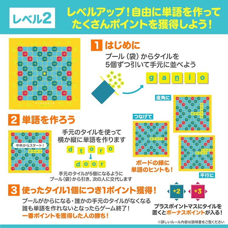 ●レベル2:自由に単語を作って、英語のスペルがレベルアップ!置いたタイルの個数とプラスポイントを計算して、最も多くポイントを獲得した人が勝ち!