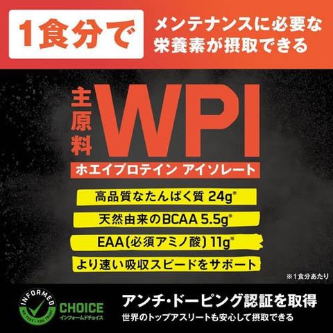 ●WPI(Whey Protein Isolate=ホエイたんぱく分離物)は純度の高いホエイプロテインの構造体で、本製品の原材料に一番多く含まれているのが大きな特徴。高いプロテイン割合を実現しています。