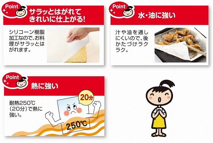 | 材質:シリコーン樹脂加工、パーチメント紙 寸法:幅25cm*長さ5m 耐熱温度:250度(20分) |