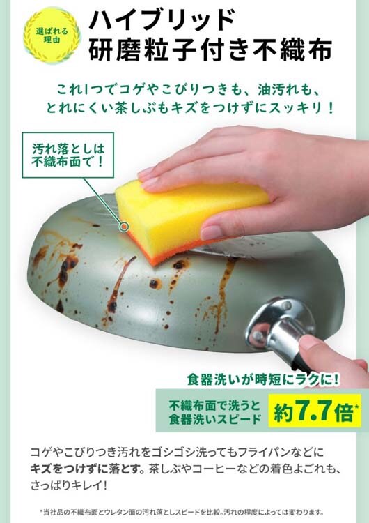 ●ハイブリッド粒子つきの不織布でこびりつきや、コゲ、茶シブまでしっかりおとす。