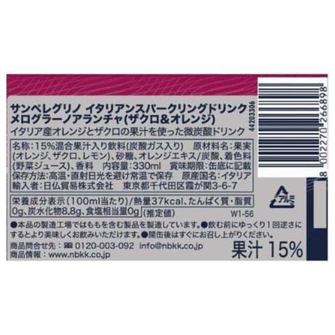 果実(オレンジ、ザクロ、レモン)、砂糖、オレンジエキス/炭酸、着色料(野菜ジュース)、香料