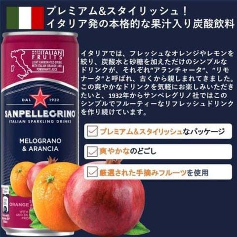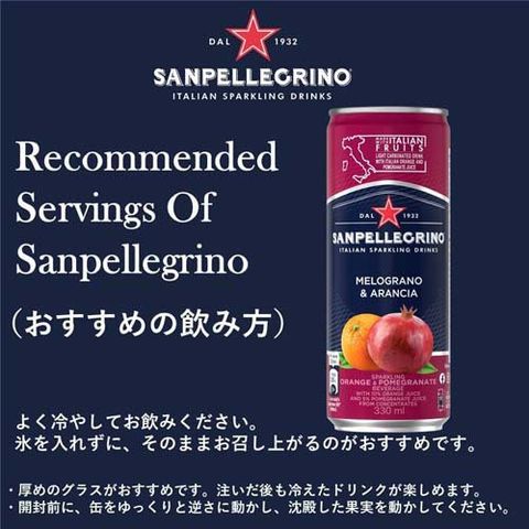 ●イタリアでフレッシュなオレンジやレモンを絞り、炭酸水と砂糖を加えただけのシンプルなレシピをアランチャータとリモナータとよび、古くから親しまれていたものを手軽にお楽しみいただくため、サンペレグリノ社がアランチャータを発売したところから始まります。微炭酸のやさしい泡で口当たりのよい飲み心地のため、お食事との相性もぴったりです。