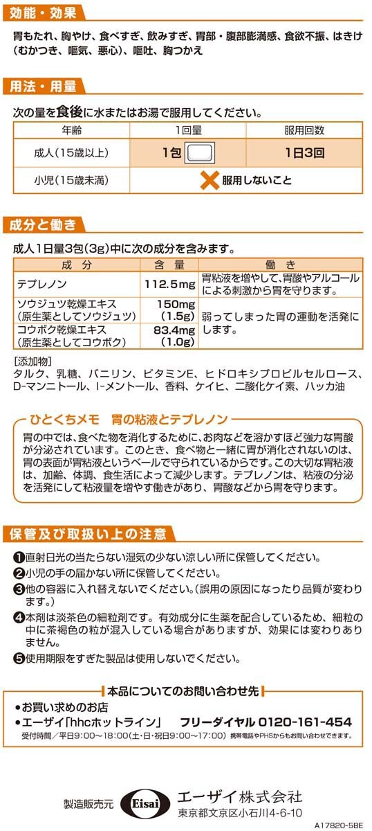 | 成人1日量3包(3g)中に次の成分を含みます テプレノン:112.5mg ソウジュツ乾燥エキス(原生薬としてソウジュツ):150mg(1.5g) コウボク乾燥エキス(原生薬としてコウボク):83.4mg(1.0g) 添加物:タルク、乳糖、バニリン、ビタミンE、ヒドロキシプロピルセルロース、D-マンニトール、L-メントール、香料、ケイヒ、二酸化ケイ素、ハッカ油 |