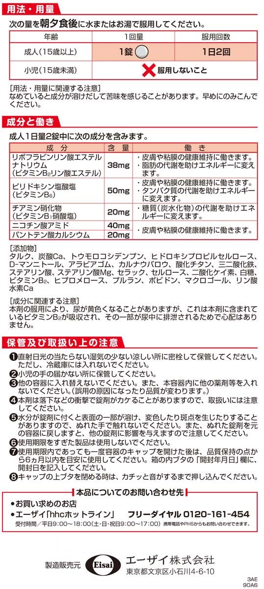 | リボフラビンリン酸エステルナトリウム(ビタミンB2リン酸エステル):38mg ピリドキシン塩酸塩(ビタミンB6):50mg チアミン硝化物(ビタミンB1硝酸塩):20mg ニコチン酸アミド:40mg パントテン酸カルシウム:20mg 添加物:タルク、炭酸Ca、トウモロコシデンプン、ヒドロキシプロピルセルロース、D-マンニトール、アラビアゴム、カルナウバロウ、酸化チタン、三二酸化鉄、ステアリン酸、ステアリン酸Mg、セラック、セルロース、二酸化ケイ素、白糖、ビタミンB2、ヒプロメロース、プルラン、ポビドン、マクロゴール、リン酸水素Ca ★成分に関連する注意 本剤の服用により、尿が黄色くなることがありますが、これは本剤に含まれているビタミンB2が吸収され、その一部が尿中に排泄されるためで心配はありません |