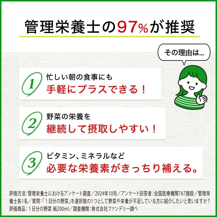 ●野菜を搾る過程で失われがちな主栄養成分が摂れるように、野菜350g分の栄養成分を算出し、きっちり補っています。