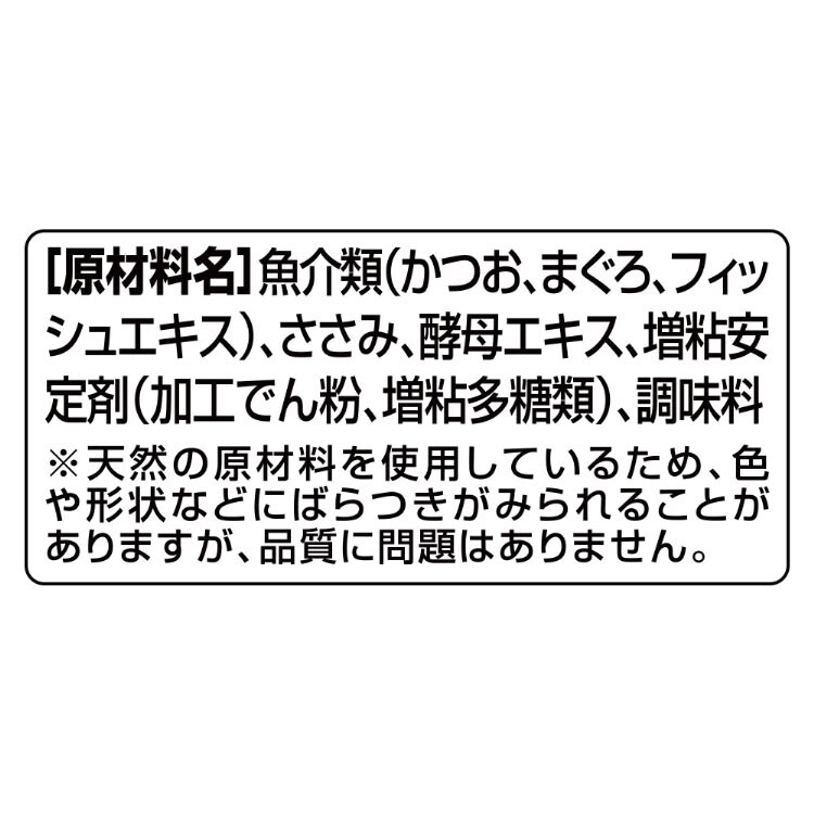 | 魚介類(かつお、まぐろ、フィッシュエキス)、ささみ、酵母エキス、増粘安定剤(加工でん粉、増粘多糖類)、調味料※天然の原材料を使用しているため、色や形状などにばらつきがみられることがありますが、品質に問題はありません。 |