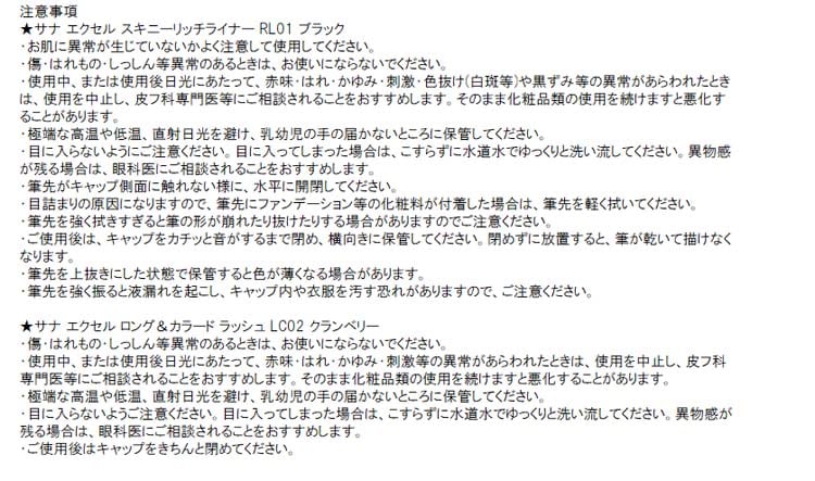| ★サナ エクセル スキニーリッチライナー RL01 ブラック 水、(アクリル酸エチルヘキシル/メタクリル酸メチル)コポリマー、BG、(スチレン/アクリレーツ)コポリマー、エタノール、パンテノール、センブリエキス、ヒアルロン酸Na、カミツレ花エキス、ポリクオタニウム-51、(アクリレーツ/オクチルアクリルアミド)コポリマー、(アクリレーツ/メチルスチレン/スチレン)コポリマーアンモニウム、1.2-ヘキサンジオール、AMP、TEA、ベヘネス-30、EDTA-2Na、デヒドロ酢酸Na、フェノキシエタノール、メチルパラベン、カーボンブラック ★サナ エクセル ロング&カラード ラッシュ LC02 クランベリー イソドデカン、トリメチルシロキシケイ酸、タルク、メチルトリメチコン、合成ワックス、ミツロウ、パルミチン酸デキストリン、セレシン、マイクロクリスタリンワックス、イソステアリン酸、カルナウバロウ、ナイロン-6、シリカ、アセチルテトラペプチド-3、ビオチノイルトリペプチド-1、オクタペプチド-2、BG、アカツメクサ花エキス、グリセリン、デキストラン、トコフェロール、パンテノール、ポリエチレン、ワセリン、水、フェノキシエタノール、(+/-)グンジョウ、マイカ、酸化チタン、酸化鉄 ★サナ エクセル ロングラスティングアイブロウ LT03 グレイッシュブラウン ★リキッド 水、BG、(アクリレーツ/アクリル酸エチルヘキシル)コポリマー、エタノール、パンテノール、AMP、スルホコハク酸ジエチルヘキシルNa、ラウレス-21、フェノキシエタノール、メチルパラベン、青1、赤227、黄4 ★パウダー 合成金雲母、炭酸Ca、トリメチルシロキシケイ酸、メチルトリメチコン、(アクリレーツ/アクリル酸ステアリル/メタクリル酸ジメチコン)コポリマー、ポリエチレン、トリエチルヘキサノイン、パンテノール、ジメチコン、トコフェロール、マイカ、酸化チタン、酸化鉄、水酸化Al |