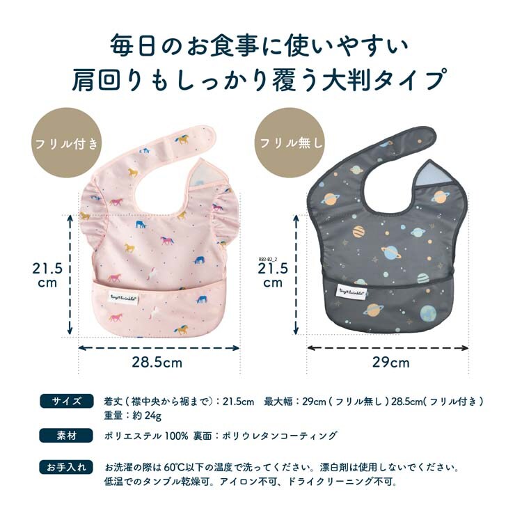 | 素材:ポリエステル 裏面にポリウレタンコーティング 着丈:襟中央から下まで 21.5cm 身幅:最大幅フリル無し29cm、フリル付き28.5cm 対象月齢:6か月~36か月 |