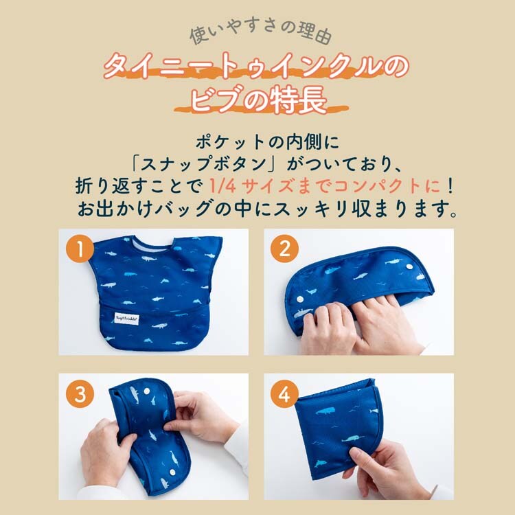 ●約1/4サイズにコンパクトにたためるスナップボタン付き。お出かけバッグの中にスッキリ収まります。