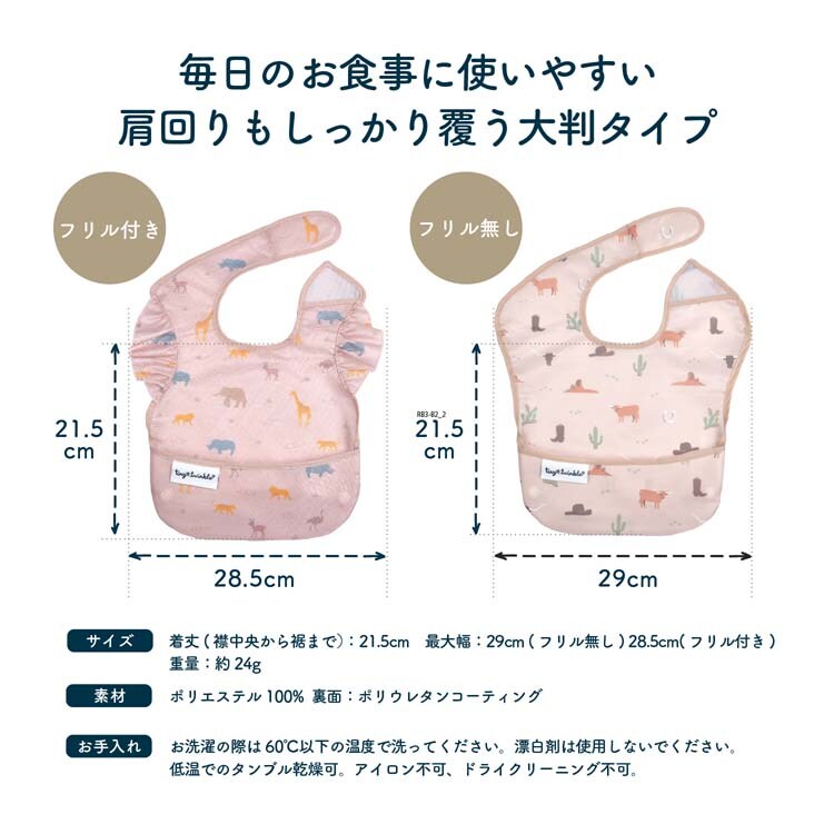 | 素材:ポリエステル 裏面にポリウレタンコーティング 着丈:襟中央から下まで 21.5cm 身幅:最大幅フリル無し29cm、フリル付き28.5cm 対象月齢:6か月~36か月 |