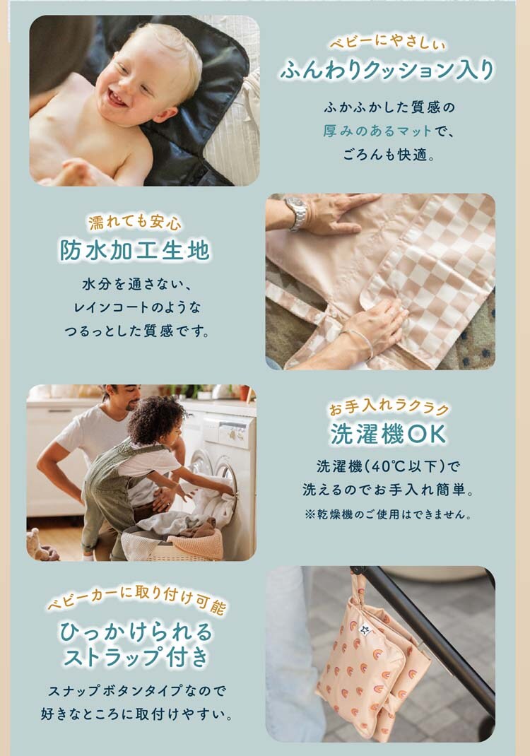 ●防水加工で、汚れがにじみにくい素材。汚れもサッとふき取れて、洗濯機で丸洗いもOK。