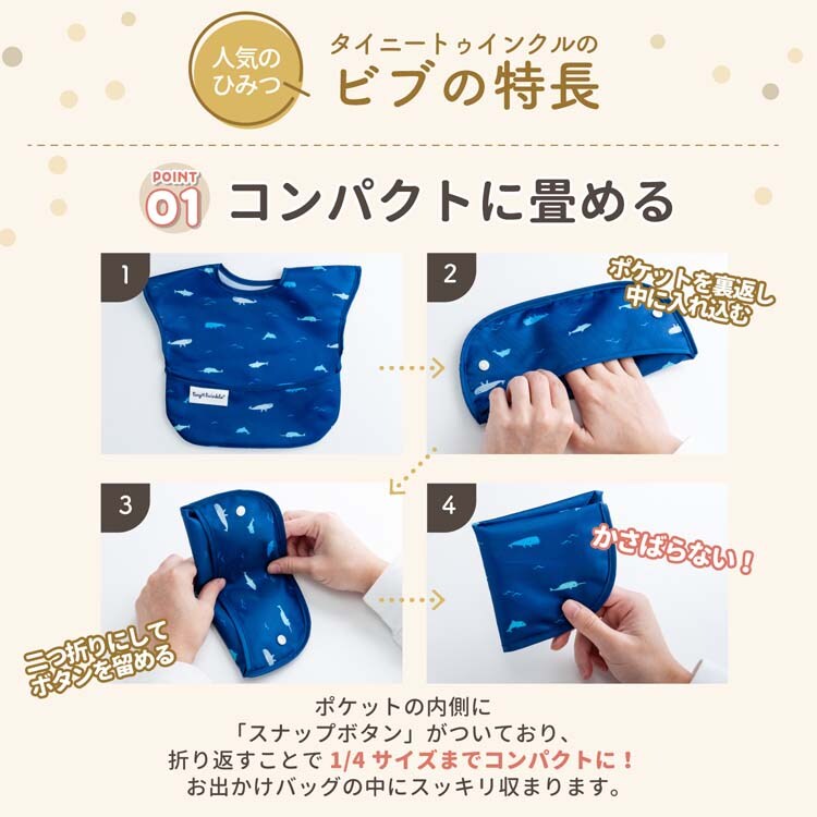 ●約1/4サイズにコンパクトにたためるスナップボタン付き。お出かけバッグの中にスッキリ収まります。