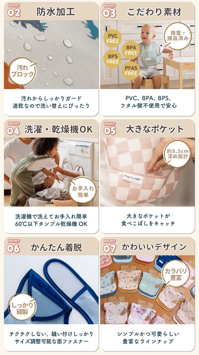 ●大きな立体ポケットが食べこぼしをキャッチ。