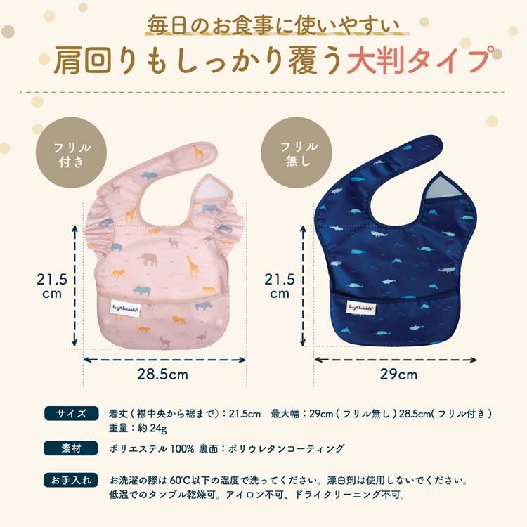 | 素材:ポリエステル 裏面にポリウレタンコーティング 着丈:襟中央から下まで 21.5cm 身幅:最大幅フリル無し29cm、フリル付き28.5cm 3枚セット 対象月齢:6か月~36か月 |