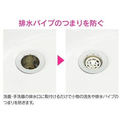 ●洗面・手洗器の排水口に取付けるだけで小物の流失や排水パイプのつまりを防ぎます。