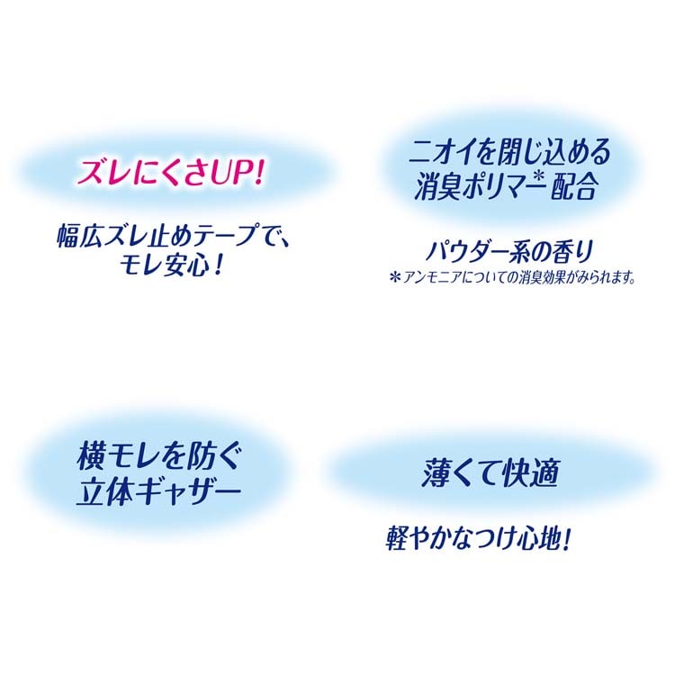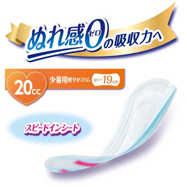 ●尿成分を研究したサッと引き込みスッと消えるスピードインシートなので、出た瞬間から表面に残る間もなく、ぬれ感ゼロの吸収力へ。