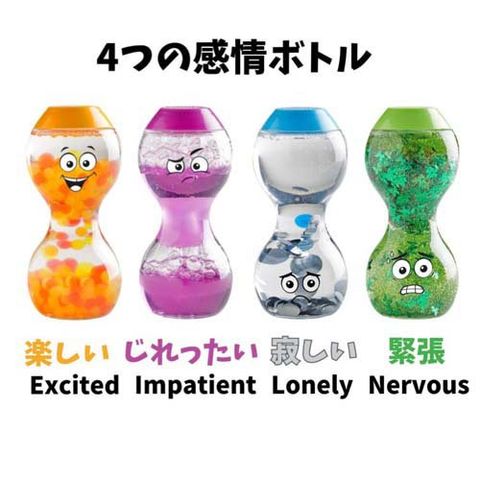 ●子どもの感情コントロールの練習にバッチリな「リラックス感情ボトル 楽しい・じれったい・寂しい・緊張 (Express Your Feelings Sensory Bottles)」は、自分の気持ちと向き合い、自分への理解を高め、感情の変化を表現するための手助けをします。