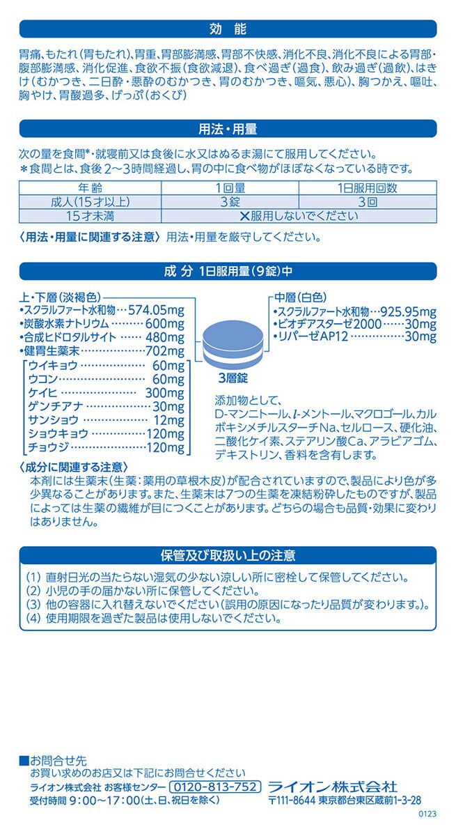| 1日服用量(9錠)中 上・下層(淡褐色) スクラルファート水和物:574.05mg 炭酸水素ナトリウム:600mg 合成ヒドロタルサイト:480mg 健胃生薬末:702mg(ウイキョウ60mg、ウコン60mg、ケイヒ300mg、ゲンチアナ30mg、サンショウ12mg、ショウキョウ120mg、チョウジ120mg) 中層(白色) スクラルファート水和物:925.95mg ビオヂアスターゼ2000:30mg リパーゼAP12:30mg 添加物として、D-マンニトール、l-メントール、マクロゴール、カルボキシメチルスターチNa、セルロース、硬化油、二酸化ケイ素、ステアリン酸Ca、アラビアゴム、デキストリン、香料を含有します。 ★成分に関連する注意 本剤には生薬末(生薬:薬用の草根木皮)が配合されていますので、製品により色が多少異なることがあります。また、生薬末は7つの生薬を凍結粉砕したものですが、製品によっては生薬の繊維が目につくことがあります。どちらの場合も品質・効果に変わりはありません。 |