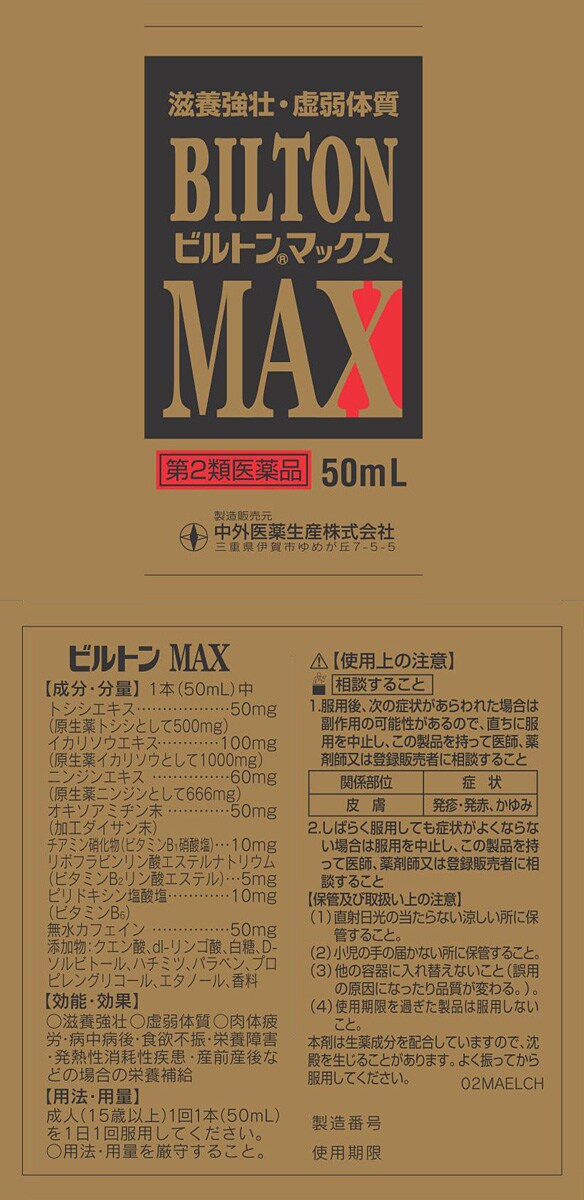 | (1本(50mL)中) トシシエキス:50mg原生薬(トシシとして500mg) イカリソウエキス:100mg(原生薬イカリソウとして1000mg) ニンジンエキス:60mg(原生薬ニンジンとして666mg) オキソアミヂン末(加工ダイサン末):50mg チアミン硝化物(ビタミンB1硝酸塩):10mg リボフラビンリン酸エステルナトリウム(ビタミンB2リン酸エステル):5mg ピリドキシン塩酸塩(ビタミンB6):10mg 無水カフェイン:50mg 添加物:クエン酸、dL-リンゴ酸、白糖、D-ソルビトール、ハチミツ、パラベン、プロピレングリコール、エタノール、香料 |