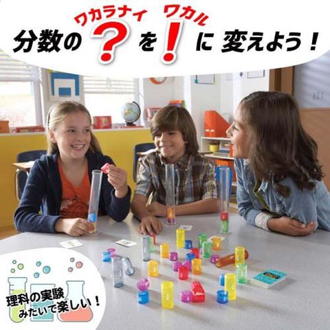 | シリンダー 4個 分数カード 52枚 分数パーツ 52個 スコアカード 20枚 教師用ガイド(英語、他3ヶ国語) |