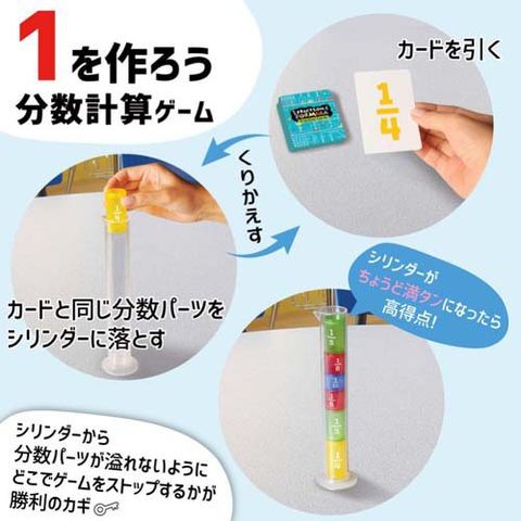 ●4人で分数カードを引き、対応する円柱型の分数パーツを見つけてシリンダーに落とし「1」を目指すゲーム。