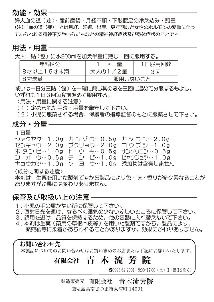 本製品についてのお問い合わせはお買い求めのお店または下記にお願いいたします。 有限会社青木流芳院 TEL:0993-62-2001 9:00-17:00(土・日・祝日を除く) 製造販売元 有限会社青木流芳院 鹿児島県南さつま市大浦町14001