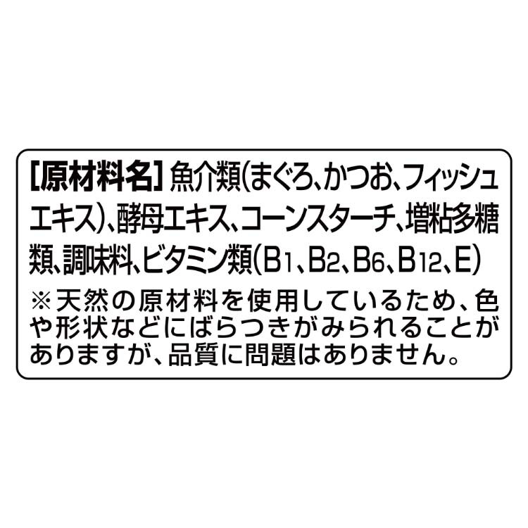 | 魚介類(まぐろ、かつお、フィッシュエキス)、酵母エキス、コーンスターチ、増粘多糖類、調味料、ビタミン類(B1、B2、B6、B12、E) |