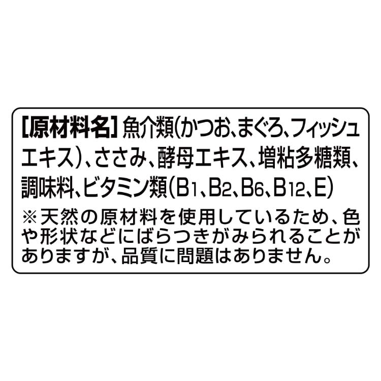 | 魚介類(かつお、まぐろ、フィッシュエキス)、ささみ、酵母エキス、増粘多糖類、調味料、ビタミン類(B1、B2、B6、B12、E)※天然の原材料を使用しているため、色や形状などにばらつきがみられることがありますが、品質に問題はありません。 |