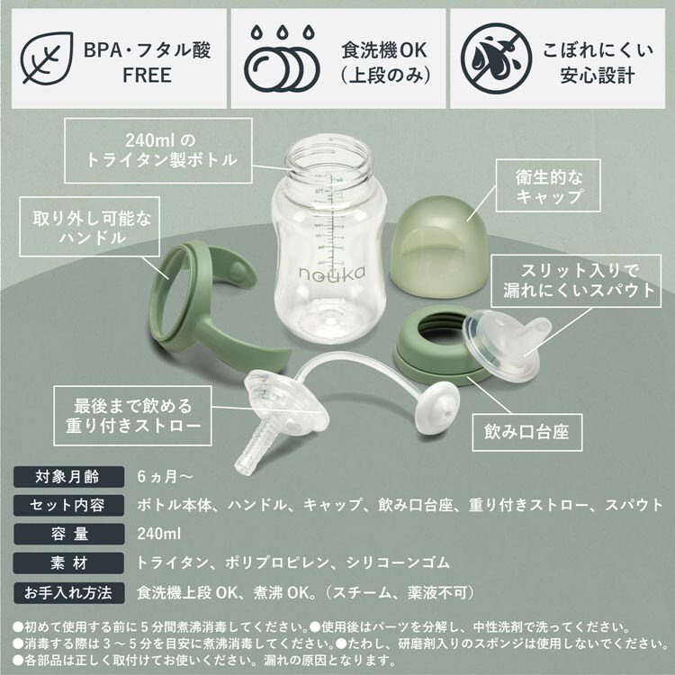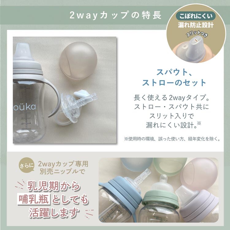 ●最大3通りの使い方:スパウト、ストローは初期セットですが、別売りニップルもご用意しています。哺乳瓶としても使えるため、乳児期から長くご使用いただけます。