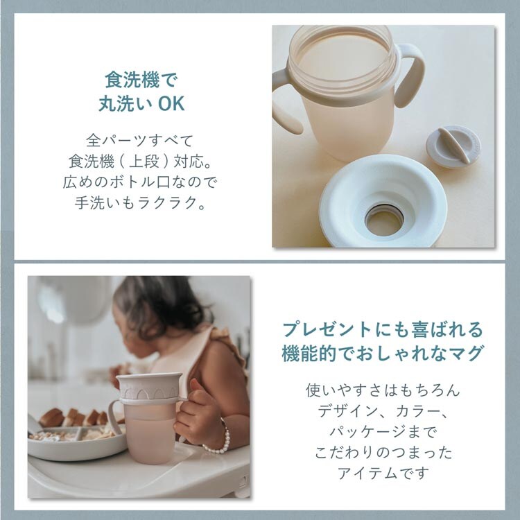 ●漏れ防止構造:擦った時だけ飲み物が出るシールフタで、こぼれにくくなっています。吸う力により飲む量を調整できるので、コップ飲み練習に最適です。