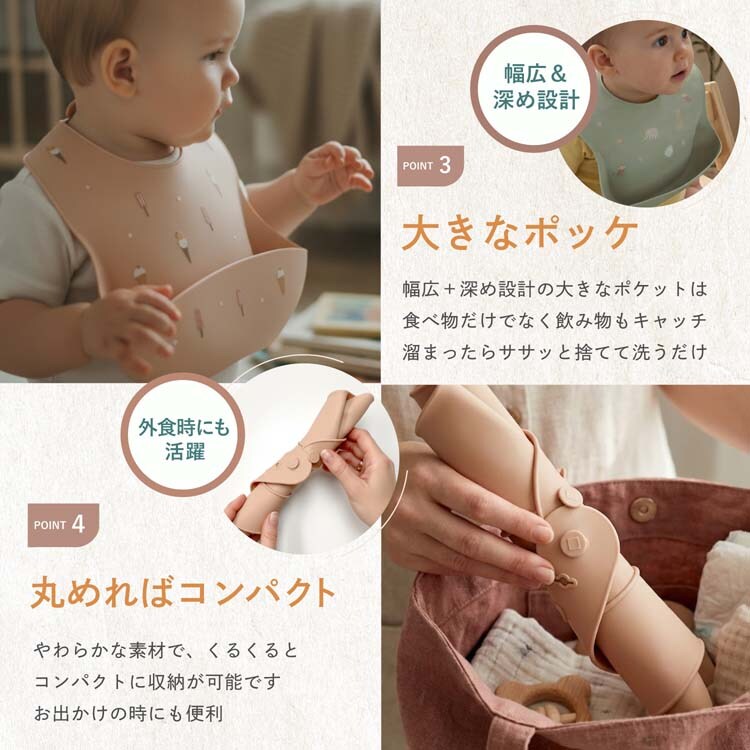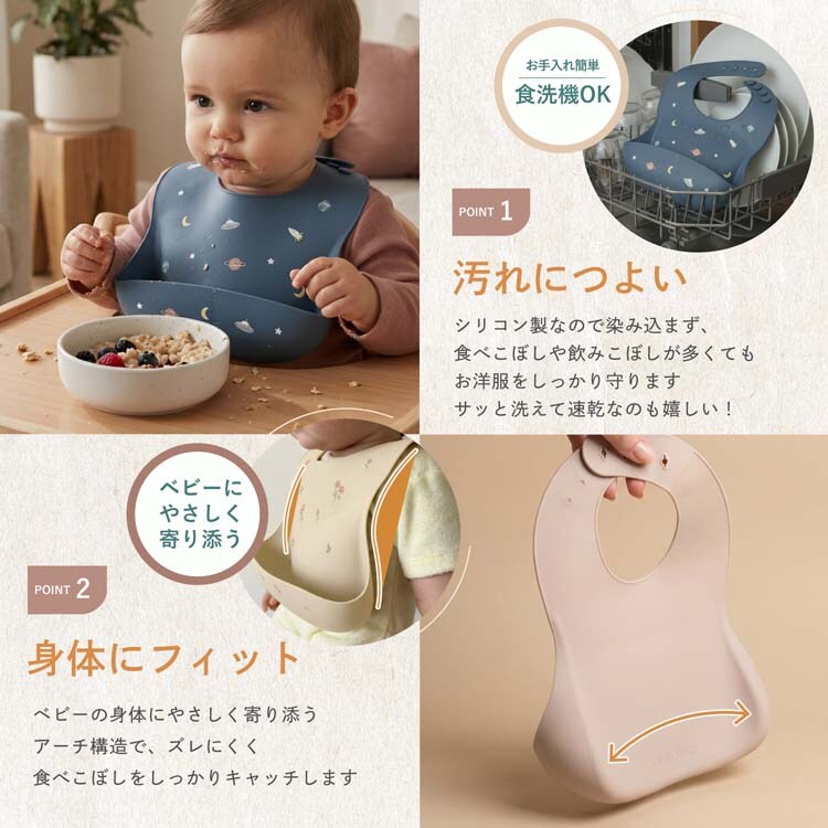 ●シリコン製なので染み込まず、食べこぼしや飲みこぼしが多くてもお洋服をしっかり守ります。