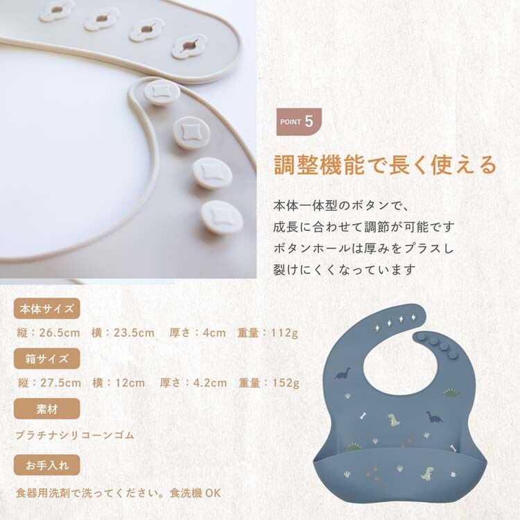●シリコン製なので染み込まず、食べこぼしや飲みこぼしが多くてもお洋服をしっかり守ります。