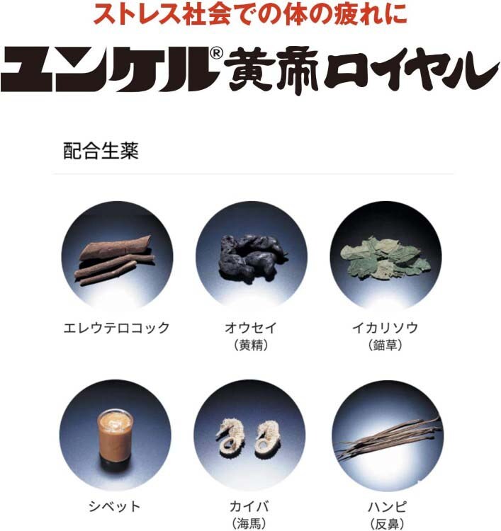 ●ユンケル黄帝ロイヤルは、エレウテロコック、黄精、海馬などの6種類の生薬にビタミンなどを配合したドリンクです。