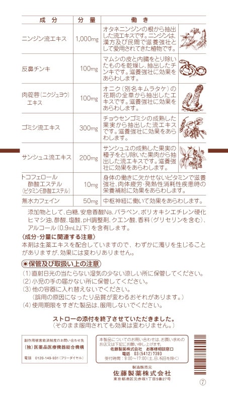 | 1瓶(30mL)中 イカリソウ流エキス:1000mg ニンジン流エキス:1000mg 反鼻チンキ:100mg 肉じゅ蓉(ニクジュヨウ)エキス:100mg ゴミシ流エキス:300mg サンシュユ流エキス:200mg トコフェロール酢酸エステル(ビタミンE酢酸エステル):10mg 無水カフェイン:50mg 添加物として、白糖、安息香酸Na、パラベン、ポリオキシエチレン硬化ヒマシ油、酢酸、塩酸、pH調整剤、クエン酸、香料(グリセリンを含む)、アルコール(0.9mL以下)を含有します ★成分・分量に関連する注意 本剤は生薬エキスを配合していますので、わずかに濁りを生じることがありますが、効果には変わりありません。 |